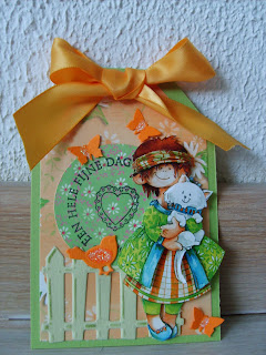 Wow, Marianne Design has got some new goodies and they are so cute! It was harder then it ever was to just buy one creatable... I've bought the fence, I love fences on cards and now I have one myself. I am really trying to not buy the cute tree and the Ivy. I've also bought a decoupagesheet of the Snoesje (the one with the cats, so adorable!). Once in a while I like it to make a tag and that was exactly the challenge at Marianne Design Challenge blog. It was really nice to use my new goodies, to use some happy-papers and the cutting really made me stressed-out! Have a lovely monday and thanks for you lovely comments!